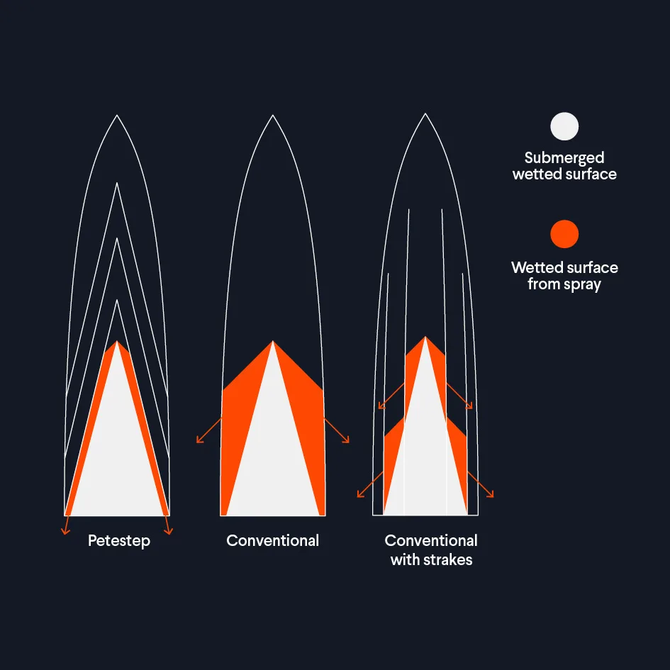 Petestep’s deflectors surround the water surface, for a specific boat in all planing speeds. This dramatically reduces the wetted surface and the friction against the hull. On conventional hulls, spray generation accounts for up to 30% of the hydrodynamic resistance. Petestep hulls don’t waste spray energy, while reducing slamming and noise. At the same time, there is a significant increase in stability in all directions. We also have the option to combine Petestep hull technology with a stepped hull to get even more speed. The net result is a superior ride compared to all other planing hulls.